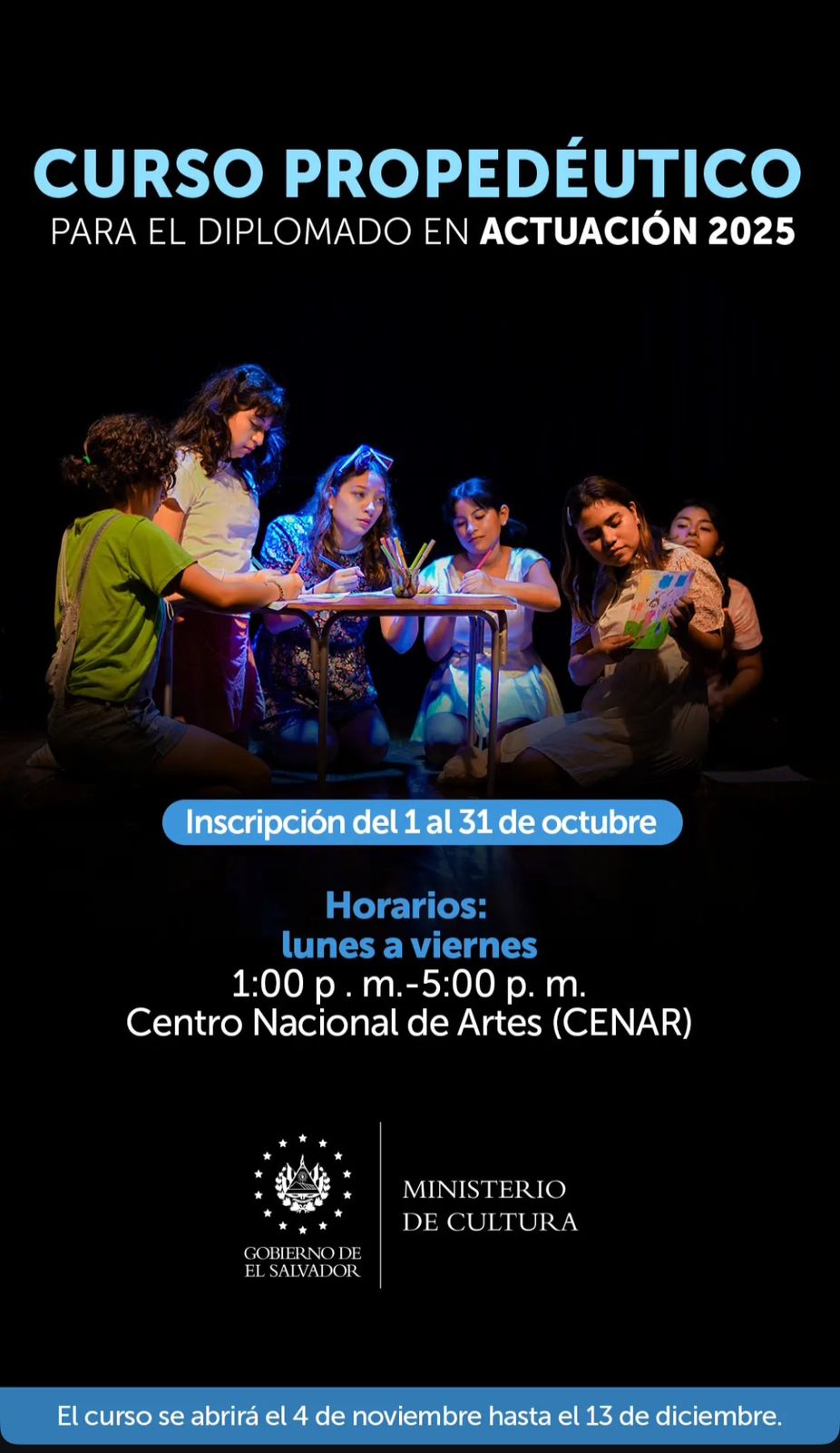Inscripción del 1 al 31 de octubreHorarios:lunes a viernes1:00 p.m.-5:00 p. mCentro Nacional de Artes (CENAR)