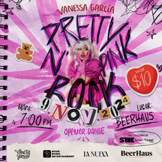 La destacada cantante Vanessa García se presentará este 9 de noviembre como parte del lanzamiento de su más reciente material y presentando su futuro álbum. El concierto tendrá lugar en Beerhaus a las 7pm. Con su característico estilo de 'rock rosado', Vanessa combina la fuerza del rock con una estética femenina vibrante, donde el color rosado es protagonista. Será una noche cargada de música y actitud, en un evento que sin duda dejará huella. ¡No te lo pierdas!.