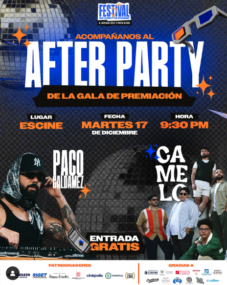 Después de la Gala de Premiación, te esperamos en el After Party del 5to Festival de Cortos Escine. Una noche para celebrar el cine, la creatividad y el talento, con música en vivo por la banda @camelo.sv y el Dj @pacogaldamez