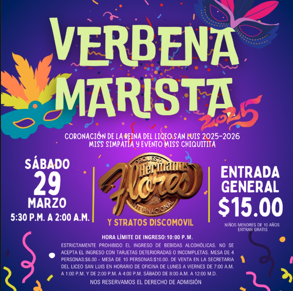 La Directiva Central de Padres de Familia del Liceo San Luis 2025, hace la invitación para el público en general, para participar de la 𝐓𝐑𝐀𝐃𝐈𝐂𝐈𝐎𝐍𝐀𝐋 𝐕𝐄𝐑𝐁𝐄𝐍𝐀 𝐌𝐀𝐑𝐈𝐒𝐓𝐀, que se llevará a cabo el próximo sábado 29 de marzo en las instalaciones del Liceo San Luis.