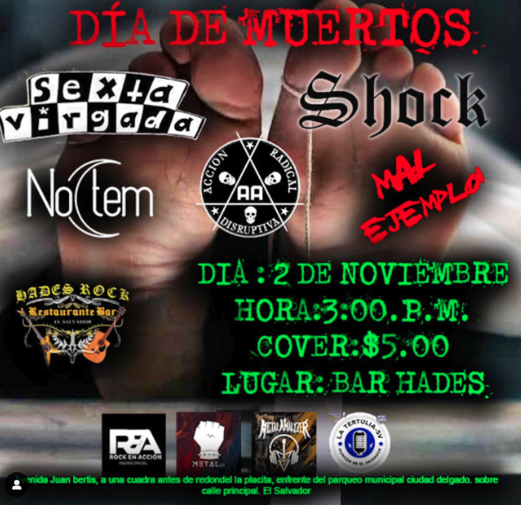 Nos vemos este sábado 2 de Noviembre a partir de las 3:00.P.M. junto a noctempunk, antisociales anonimos, la sexta virgada , mal ejemplopunk rock, estaremos disfrutando de buena musica y amigos en el hades rock metal bar ,no se lo pueden perder