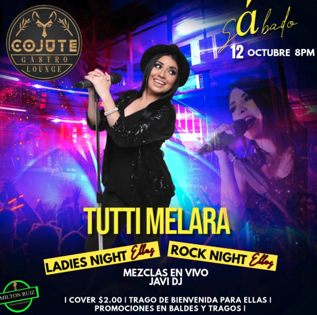 VENITE ESTE SÁBADO 12 DE OCTUBRE Y DISFRUTA DE UN ESPECIAL "LADIES NIGHT (PARA ELLAS) Y ROCK NIGHT (PARA ELLOS)" EN LA VOZ INIGUALABLE DE @tutti.melara 💃